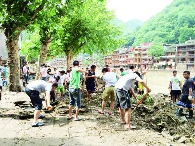 洪水过后, 凤凰古城的人们抓紧清扫垃圾。
