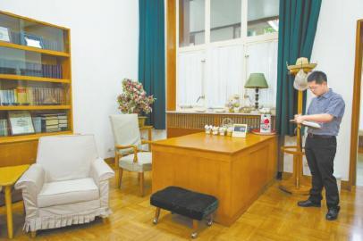 在邓小平生前的办公室,书柜里放着他爱看的《二十四史》、《资治通鉴》等,写字台上摆着孙辈们送给他的礼物,台历则定格在 1997 年 2 月19日(邓小平逝世之日)。