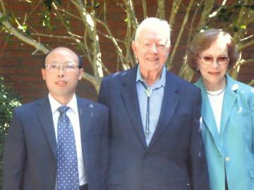 卡特的家Plains(平原市)离他所在的大学仅15英里。每两周,卡特一般会回来一次。“他每次回去都会发表公开演讲。”林伯海说,86岁的前总统先生很少在这个场合跟别人主动握手,“但是第一次聆听过他的演讲,幸运就降临到了我的身上。”林伯海回忆说,他在美国的合作导师恰好是研究卡特的专家,那年9月份,在合影的人群中,卡特唯独向他走了过来。