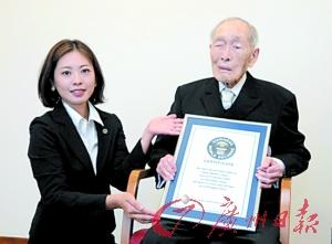 20日,百井在疗养医院接受世界最长寿男性证书。