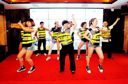 湖北日报讯 图为:16日,孝感义工联志愿者发布自编自演的“防溺水宣传”版《小苹果》MV并进行现场表演。今夏,孝感义工联组建的夏季“防溺水”安全教育义务巡逻队活跃在全市各地。(记者张朋 王云清 摄)