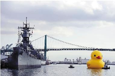 8月20日,大黄鸭穿过美国洛杉矶港的文森特·托马斯大桥,从一艘军舰旁游过。当日,周游世界的大黄鸭现身洛杉矶。大黄鸭由荷兰艺术家弗洛伦泰因·霍夫曼创作,其可爱造型一经推出即广受欢迎。 新华社记者 杨磊 摄