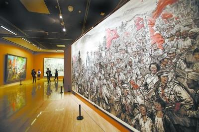 昨天,在中国美术馆的展厅里,观众可以看到巨幅油画《会师井冈》。当天,“丹青中国梦——庆祝中华人民共和国成立65周年美术作品展”在这里开幕。 本报记者 饶强摄