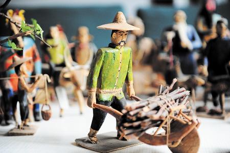 这两年,刘永希做得最多的是人物、动物,还有脸谱,把作品摆在客厅中,琳琅满目,参观者都赞叹不已。大的作品颇具分量,有“脸谱”、“双龙烛台”等,小的可置于手心,如“蓑翁垂钓”、“农夫挑水”,也就半个拇指长,人脸还不足小拇指盖那么大。