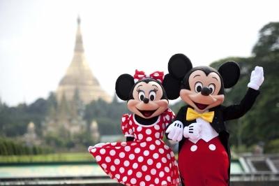 9月25日,迪士尼卡通角色米奇(右)和米妮在缅甸仰光的苏拉塔前亮相,这是迪士尼卡通角色首次在缅甸登场。新华社发