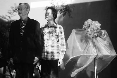出席仪式的佟麟阁的儿子佟兵和女儿佟亦非与雕像合影,然后他们转过身,默默凝望雕像表达深情。