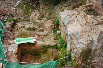 目前整个发掘已结束,昨天扬子晚报记者回访现场,整个考古工地已被围挡,大部分探方已经用几米高的封土回填。而遗址内部是与老虎山山体相连的石壁,顶面留存着规制整齐划一、四面凿开的矩形条石。考古部门表示,这是600年前明代工匠在老虎山下开凿建材时,留下的半成品。条石与条石之间沟壑状的直线凹痕,就是人工开凿的痕迹。