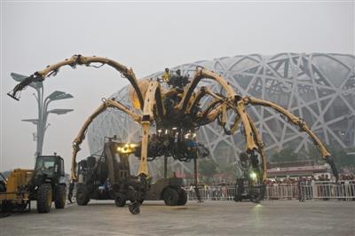 调试中的巨型机械“蜘蛛”。新京报记者 周岗峰 摄