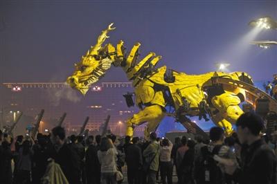 据活动组织方介绍,“龙马”大型机械装置是取自中国成语“龙马精神”的神兽,由法国La Machine协会利用独特的艺术方式和先进的科技手段,将龙头和马身组合成的奇幻性大型表演装置机械,是设计师弗朗索瓦·德拉豪兹叶赫(Fran ois Delarozière)为纪念中法建交50周年设计的。“龙马”今年8月曾在法国北部城市南特亮相。为了准备此次北京巡演,9月30日,特意由大型运输机安-124从法国空运到京。