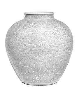 这件清乾隆“御制粉青釉浮雕龙纹罐”雕有精美的苍龙教子图案,长龙双目炯炯,轮廓分明,身披细鳞,穿梭祥云;幼龙在下,自水而出,昂首相视,龙躯盘曲在汹涌浪涛之中。底署“大清乾隆年制”三行六字方篆款,雕工利落。作为本次苏富比秋拍的亮点之一,该罐以5000万元港币起拍,最终以9420万元港币成交,约合7400多万元人民币。
