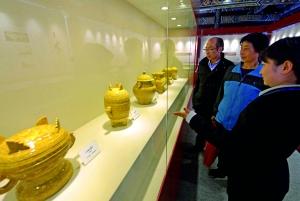 昨天,在中山公园社稷文化展上,观众参观高仿真的豆、爵、簋等祭祀展品。北京中山公园是在明清两朝社稷坛基础上辟建而成。1914年社稷坛辟为城市公园,初称中央公园。同年10月10日开放,成为京城中心区第一家向公众开放的公共园林。即日起,中山公园免费推出园史展、图片展等,纪念百岁生日。 首席摄影记者 吴宁/摄