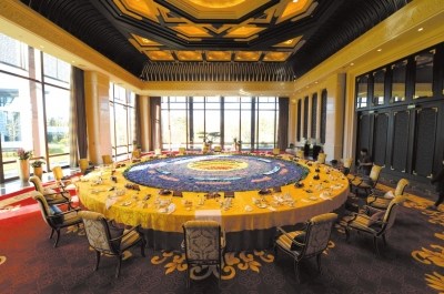 环视约1200平米的会议厅,中间摆放的圆桌周围放着明代风格的木质座椅,桌面上放有两个景泰蓝材质的开关和领导人专用的“文房四宝”。桌上还有一支印有天坛、顶上有红宝石的钢笔,桌子内层为装饰性圆盘,上面摆满各式花朵。