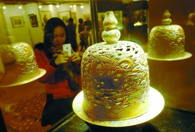 图为一名观众在欣赏乾隆年制款描金镂空五龙纹三足大熏炉。