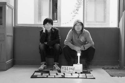 ▲乌青(左)和堂弟六回在工作室内卖诗歌卡片,有时他们还会到街上摆摊儿。