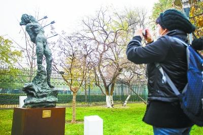 观众正在欣赏放置在中国美术馆前广场西侧草坪的《圣塞巴斯蒂安》。
