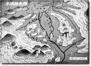 白村江战役后,日本在九州的太宰府建“水城”,防范唐朝和新罗军队进攻日本本土。图为日本人绘制的“水城”布防图