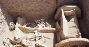 此次发掘重要的发现是在发掘出的两座车马坑中出土了秦人战车。侯宏伟介绍说,这辆战车的车厢、车轮、车辕、车轭等构件保存比较完整,驾车的两匹骏马的骨架也清晰可见,两马中间还摆放着一杆长约3米的长矛。“据推断,这一战车的时间约为春秋早期,距今约2700年至2600年,为研究秦早期的作战车马及历史文化提供了宝贵的实物资料。”