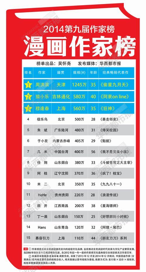 今日,由华西都市报独家发布、黄龙溪谷总冠名的“2014年第九届作家榜”子榜单——“漫画作家榜”再次重磅推出。天津漫画家周洪滨以1245万元的作品版税收入第三次占据此榜榜首,吉林漫画家猫小乐和上海漫画家穆逢春分别以580万元和560万元的收入位列二、三位。与去年榜单相同的是,今年上榜漫画家依然是15位,不过仔细观察今年榜单后不难发现,漫画行业在一年间,还是发生了一些可见的变化。