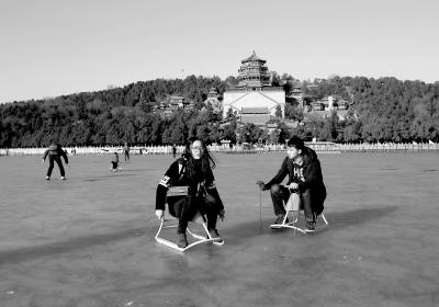 昨天,游客在颐和园排云殿下的昆明湖上畅滑,从冰面360度欣赏颐和园冬季景色。本报记者 吴镝摄