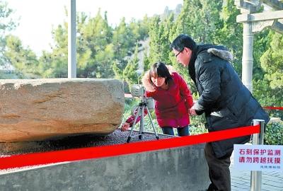 12月29日,工作人员检查安置在茂陵石刻旁的监测设备。