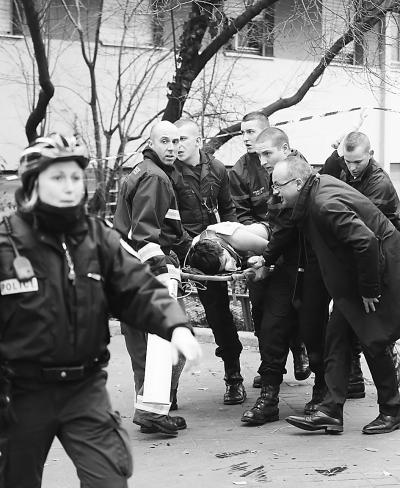 警察和消防员在遭受袭击的《沙尔利周刊》总部外用担架运送一名袭击受害者。
