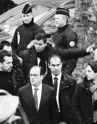 在法国巴黎,法国总统奥朗德(前)来到遭受袭击的《沙尔利周刊》总部。