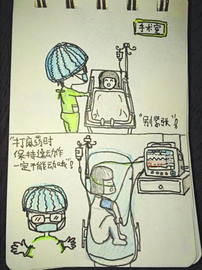 漫画图文并茂,超级有爱。不仅文字简洁,配有体位示意图、医生手术图、可爱的宝宝图,还用彩笔涂上了颜色,十分有趣。画漫画的麻醉师姚翔说,他觉得他这样做很平常,“我就想她安全。”