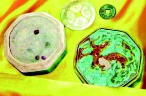 八角形盒中装有5颗大小不一且形状各异的晶体颗粒,还有一枚刻有“金玉满堂”字样的钱币。据介绍,在佛教中,僧人火化后,所产生的结晶体,则称为舍利子。