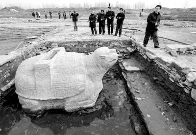 因洪水肆虐而被深埋水下330多年的“东方庞贝”泗州城,经过三年多的考古发掘,已确定了古泗州城遗址范围。图为2014年12月在江苏省盱眙县淮河镇城根村泗州城遗址拍摄的碑座。新华社发