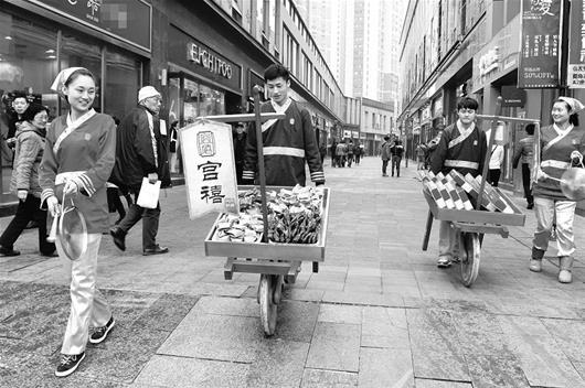 “古代商贩”闹市卖糕点 老字号糕点铺走复古路线