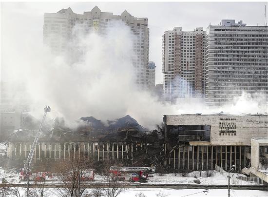 据俄媒报道,位于俄罗斯首都莫斯科有近百年历史的俄科学院社会学信息研究所图书馆近日遭遇大火,大火于2月1日凌晨被完全扑灭,约15%藏书被毁,目前清理工作仍在进行。图为1日,发生火灾的图书馆冒出浓烟。 新华社发