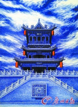 喜欢圆珠笔画的刘凯对古建筑情有独钟,他创作的许多作品都与当地传统建筑有关。他画中的山西乔家大院,高墙深宅,老砖旧瓦,蓝色的格调给人以一种别样的感觉,“自己对这座宅子里的故事也有一点耳闻,感觉它是历史长河中的一抹奇彩。”这是刘凯最喜欢的作品之一。刘凯的另一幅楼阁作品亦是得到了许多网友的赞赏,画中文字均为小篆,上匾台名,中匾署名,下匾画名,原诗以砖雕形式画于台壁。对古诗词颇有兴趣的刘凯告诉记者,建筑本体是参考山西常家大院内观稼阁所作,命名《千古绝唱》的原因是创作时赋予这座楼阁的身份是“幽州台”,唐人陈子昂有首名篇曰《登幽州台歌》,读之酣畅淋漓,神哭鬼泣,灵感便是由此而来。