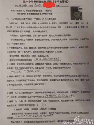 “小钠(Na)、小镁(Mg)、吕铝(AI)今年都上《一年级》,他们和高铁(Fe)、童铜(Cu)、金刚小弟(C)、金大哥(Au)还有小明共8个小伙伴有约去洗澡,在路上,大家高兴地唱着《小苹果》和《我的滑板鞋》还有《天路》,大伙听着也是醉了。”昨天下午,网友“南外脊梁”最先贴出一套厦门双十中学寒假趣味化学题,充满网络风格的词汇和文风,让众多网友直呼“剧情太醉人”,纷纷评论转发。