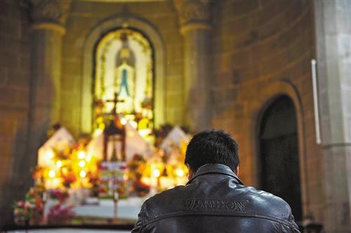 璧山区露德堂,一位教众在教堂内祷告。记者 崔力 摄