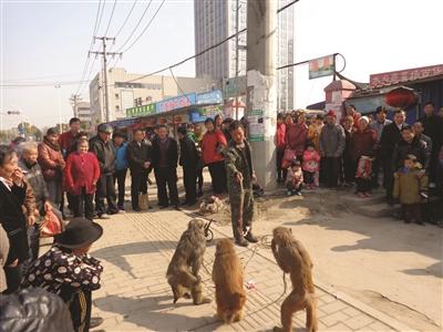 群众围观耍猴卖艺
