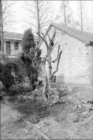 4月8日下午,现代快报记者接到信息后迅速赶往了皂河镇,大树原本生长在该镇计生办的后院里。当地村民介绍,这里曾是皂河镇政府的办公地,镇政府迁走后,这里成了计生办。院落前半部分为办公场所,后院给村民居住。
