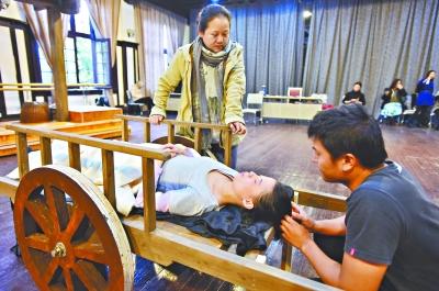 演员正在排练:田汉生把田阿惠从积庆里救出来,用板车将她送到龙王庙码头,又用江水为她洗头 记者郭良朔 摄