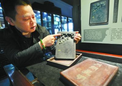 4月9日,湖南文物商店,收藏家莫俊海向记者介绍月朗星明砚台。