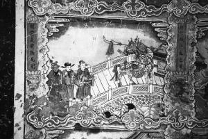 “殿内东、西两壁壁画保存比较完整,北壁仅有少量壁画保存下来。壁画内容是《关帝圣迹图》,上下分四栏,采用了连环画的构图形式,东壁绘20幅,西壁22幅,每幅都有榜题,也可以说是文字说明。主题明确,图文对照,是传记性的连环画。”郝建文透露,殿内的《关帝圣迹图》前后顺序呈之字形——始于东壁右下角的《刘关张桃园结义》,到右上角的《曹公奉送十美女》止,然后转接西壁最下方右侧的第一幅《曹公进送赤兔马》,到最上方右侧的《三顾诸葛出茅庐》结束。画幅上下用彩云图案分界,左右则用比较宽的彩带间隔,“间隔带上绘有人物、动物和瓜果蔬菜等。人物中有蹲着抽烟袋的老人,有光屁股玩耍的孩童;瓜果蔬菜则有南瓜等北方常见蔬菜。”