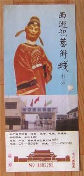记者昨天在网站“中国收藏在线”还找到了一张“西游记艺术城”的门票,据拍卖者介绍,票面上写着:西游记艺术城位于河西新区主干道江东路、应天路、赛上路之交会地带,由兴隆街道办事处筹资二千五百万建造。宫中三十八道场景,均依据中国古典名著《西游记》中唐僧师徒历经九九八十一难为题材。艺术城前,救生寺大殿金碧辉煌。艺术城周,烽火墙制作古色古香。艺术城角,欧式城堡造型逼真。艺术城中,现代之声、光、电技术与舞台艺术巧妙结合,生动地再现了《西游记》中光怪陆离、变化莫测之奇异场景:盘丝洞、白骨洞,洞洞有险;女儿国、天竺国,国国有情。真可谓:人在景中游,情在景中生。登上城头,唐代诗仙李白立于金陵凤凰台上吟诵之千古名诗:“三山半落青天外,二水中分白鹭洲”之古景新貌尽收眼底,令人流连忘返。