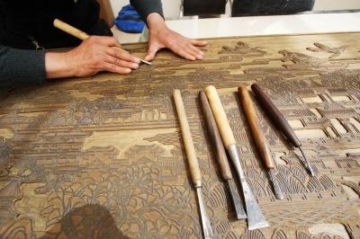 陈义时介绍,这块单版雕版作品的画面是采用阳刻的方式。因为画面太大,所以在雕刻过程中,要充分考虑到将来印刷时的效果。“版子较大,肯定要有几个人同时操作,容易造成墨色不均和落脏的情况。”