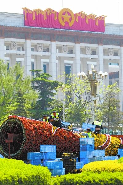 记者了解到,今年五一天安门广场摆花仍沿用历年方案,东西两侧各9个花球、6根花柱,3000多平方米花带。花球直径大小不一,最大的直径2米;花柱依然采用祥云图案,花材以四季海棠、非洲凤仙、天竺葵等当季本土花卉为主。负责施工的工作人员表示,天安门广场五一花卉布置工作预计于27日完工。从目前的情况来看,抗日战争胜利70周年庆祝花坛的摆放不会影响两侧花带的撤出时间,初步计划是在国庆后撤出广场,与往年摆放时间一致。