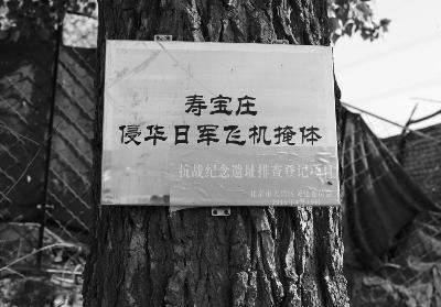 在建筑南侧一棵杨树上,钉着一块不锈钢文保牌,上刻“寿宝庄侵华日军飞机掩体”,还贴着一张红纸,上书“抗战纪念遗址排查登记项目”。这是大兴区文化委员会2015年4月10日制作的。
