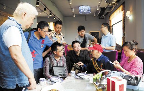 昨日中午,在湘江边一家主题餐厅里,抗战老兵唐曦的百岁生日庆祝活动正在举行,湖南老兵之家和其他机构共100多名义工赶来祝寿。唐老一直乐呵呵的,看起来身体硬朗,能自如走动。尽管耳朵听不见,但记者通过文字与其交流,发现老人回忆70多年前的战争岁月时,叙说非常清晰,记忆力惊人。