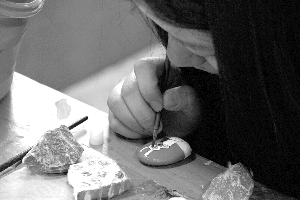 走进原美楼的陶艺教室,绘画用品和鹅卵石堆满了桌子,李相思和同学正专心致志地给选好的鹅卵石上底色。“拣来的石头洗干净后,先上一层乳白色的油画底料,干了以后用水粉和丙烯颜料上色,最后还要再上一层透明指甲油,保持颜色不脱落。”李相思告诉记者。
