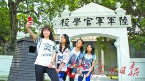 一群年轻人被黄埔军校特别的大门所吸引在自拍留念。据悉,黄埔军校每年接待来自全球的游客逾百万人次。