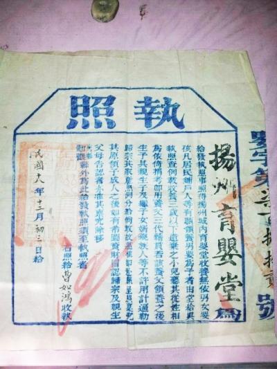 如今想领养孩子,必须遵循《中华人民共和国收养法》,那么过去的婴儿领养又是怎样的程序呢?扬州市民朱先生就收藏有一张非常罕见的民国扬州育婴堂“执照”,相当于现在的“领养证书”。这份执照上的扬州育婴堂在何处?育婴堂又有哪些故事呢?