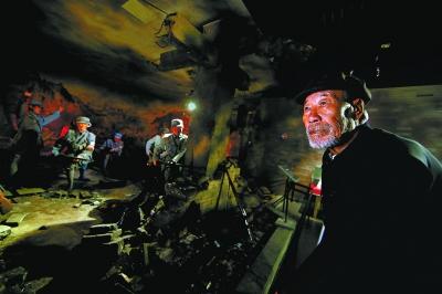 ▲平北是康玉先参加战争时的主战场,到平北抗日纪念馆去参观是他多年的心愿。在延庆县民政局的帮助下,已7年没出过远门的康玉先终于如愿。看到张家口抗日战争雕塑群区里再现的战争情景,老人陷入了深深的回忆。就是因为在张家口战斗中负伤,他才含泪告别沙场。