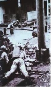■ 我军攻克平江,在巷战扫射残敌的情景