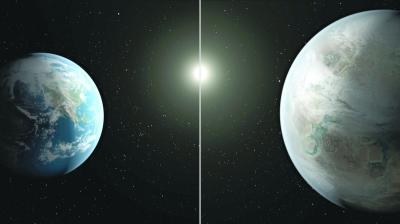 这颗行星由美国开普勒太空望远镜发现,命名为开普勒452b,距离地球1400光年。它的体积比地球大60%,“年龄”60亿岁,甚至比太阳还大15亿年。开普勒452b围绕一颗恒星旋转,距离刚好处于“宜居带”中,即表面温度允许液态水存在。它的公转周期为385天,接近地球的公转周期。